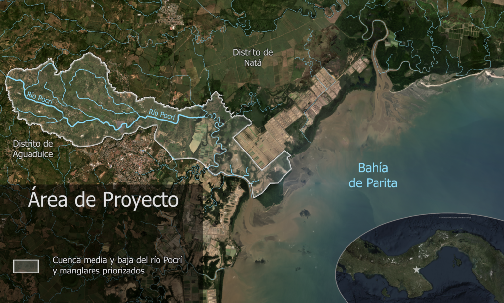 El proyecto se desarrolla en la subcuenca baja del río Pocrí y su desembocadura en el estero Palo Blanco, integrando acciones en ecosistemas fluviales y costeros. Esta intervención forma parte del paisaje prioritario de la Bahía de Parita, donde Wetlands International Panamá ha trabajado en los últimos años en restauración participativa de manglares, fortalecimiento de capacidades locales y el impulso de soluciones productivas sostenibles.