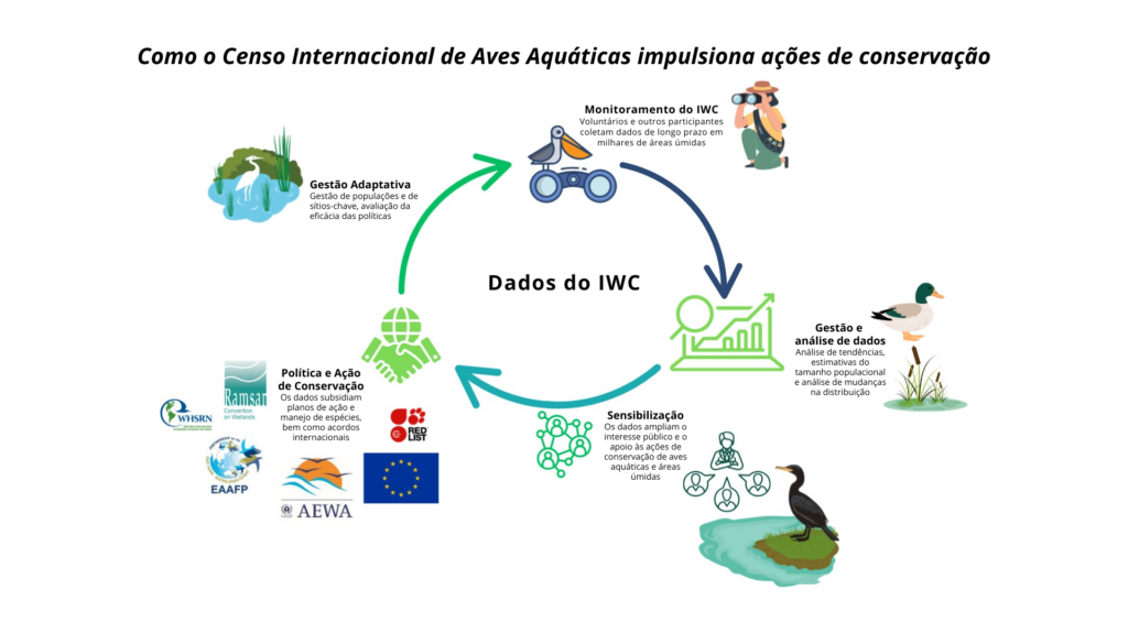 O que começou como um levantamento regional há 60 anos tornou-se uma das mais importantes fontes de conhecimento do mundo sobre aves aquáticas e áreas úmidas. As informações coletadas pelo IWC orientam ações concretas de conservação — protegendo áreas úmidas, subsidiando políticas internacionais e contribuindo para o cuidado de milhões de aves aquáticas em todo o mundo. Os objetivos do censo são: