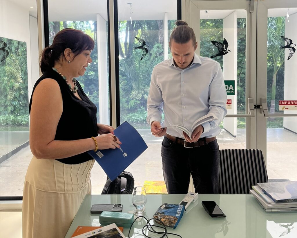 Durante a visita à Embaixada, foram apresentados o Programa Corredor Azul, as ações realizadas dentro do componente Modos de Vida, com destaque para o Território Indígena Kadiwéu, além de iniciativas voltadas ao fortalecimento de áreas protegidas, restauração ecológica, soluções baseadas na natureza e o avanço de debates sobre mecanismos inovadores de financiamento, como créditos de biodiversidade.