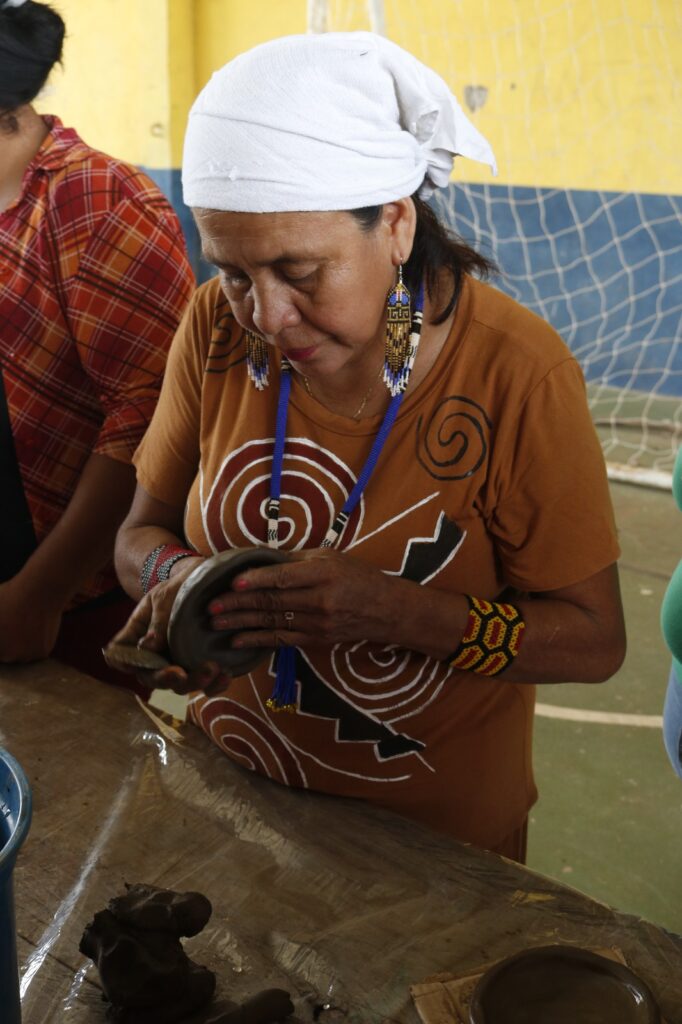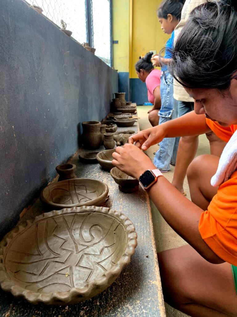 Durante o curso, as participantes trocaram conhecimento e aprimoraram técnicas de desenho, pintura e queima da cerâmica, etapas essenciais para a produção das peças tradicionais do povo Kadiwéu. A oficina reuniu principalmente artesãs das comunidades e buscou fortalecer tanto a qualidade da produção quanto a transmissão de saberes tradicionais entre gerações.