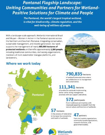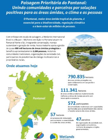 Com enfoque em escala de paisagem, a Wetlands International Brasil e a Mupan – Mulheres em Ação no Pantanal atuam no Pantanal Norte e Sul, integrando conservação, manejo sustentável e geração de renda. Nosso trabalho apoia a gestão de quase 800 mil hectares de áreas úmidas protegidas e beneficia aproximadamente 2.280 pessoas, incluindo comunidades tradicionais, organizações da sociedade civil, participantes de plataformas de diálogo multissetoriais e proprietários rurais.