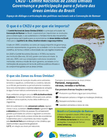 O Comitê Nacional de Zonas Úmidas (CNZU) é o principal articulador da Convenção de Ramsar no Brasil, responsável por impulsionar as resoluções para a conservação, o uso sustentável e o fortalecimento dos mecanismos de governança participativa para os ecossistemas de áreas úmidas no Brasil, vitais para o equilíbrio do clima, biodiversidade e segurança hídrica.