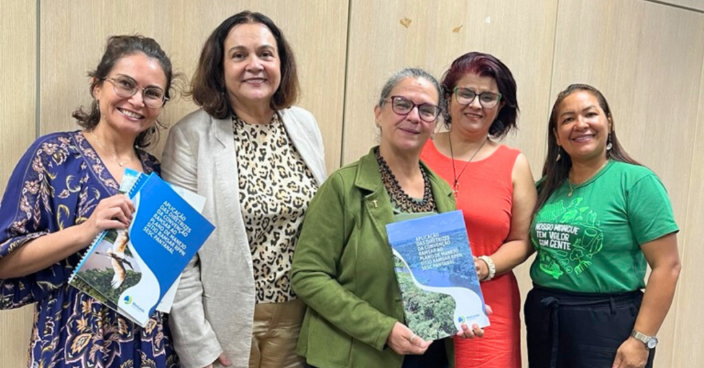 No dia 10, Áurea Garcia e a pesquisadora Cátia Nunes, professora da UFMT – Universidade Federal do Mato Grosso e pesquisadora do INAU – Instituto Nacional de Ciência e Tecnologia em Áreas Úmidas, realizaram a entrega do kit “Aplicação das Diretrizes da Convenção Ramsar ao Plano de Manejo Sítio Ramsar RPPN Sesc Pantanal” à Rita Mesquita, secretária nacional de Biodiversidade, Florestas e Direitos Animais (SBio/MMA).