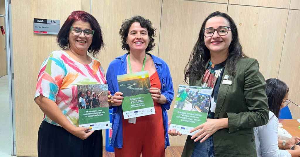 Na mesma ocasião, também foi entregue a Nadinni Sousa, coordenadora-geral do Departamento de Conservação e Uso Sustentável da Biodiversidade do Ministério do Meio Ambiente, um conjunto de materiais voltados ao fortalecimento da restauração ecológica no Pantanal e em outras áreas úmidas brasileiras, reunindo publicações técnicas produzidas pelas instituições.